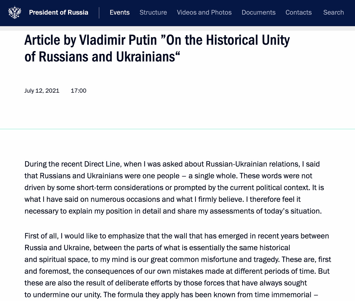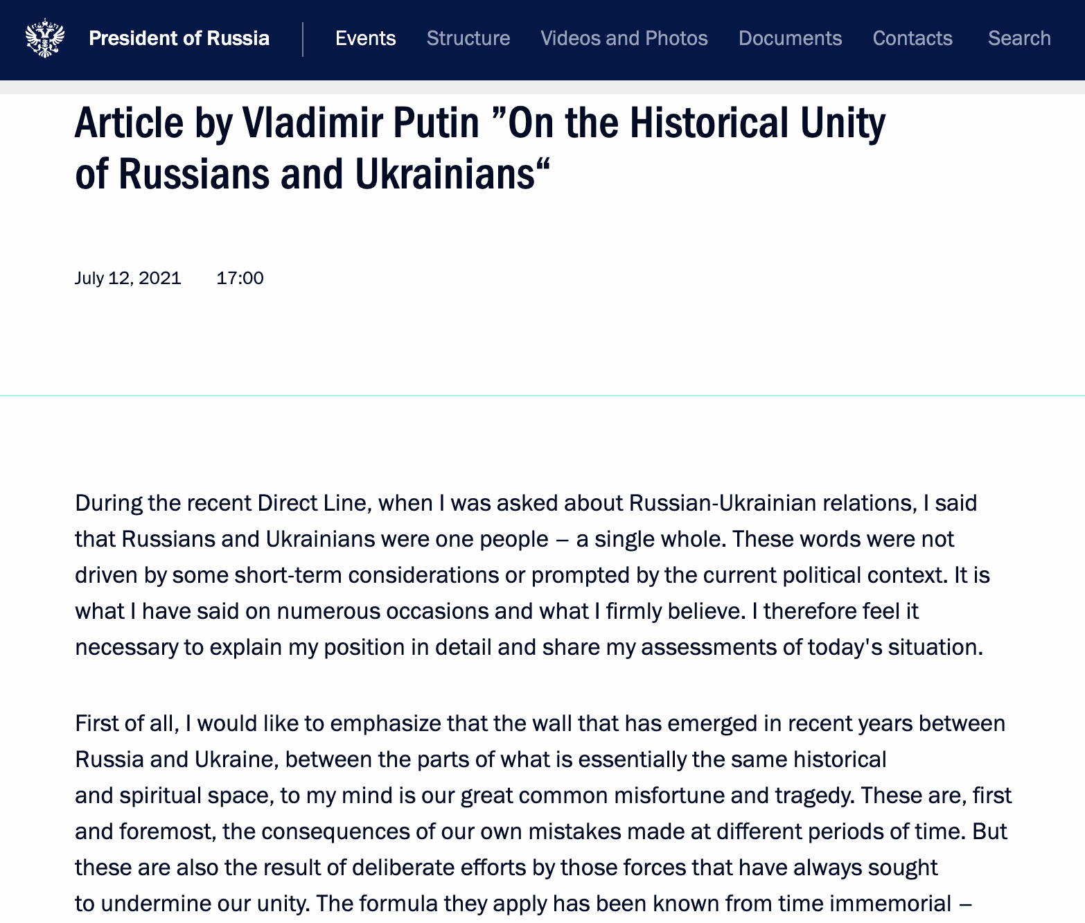 These be inferred from a range of actions taken by the Kremlin prior to the war, including updates to Russia’s National Security Strategy and Putin’s manifesto on the ”On the Historical Unity of Russians and Ukrainians“: