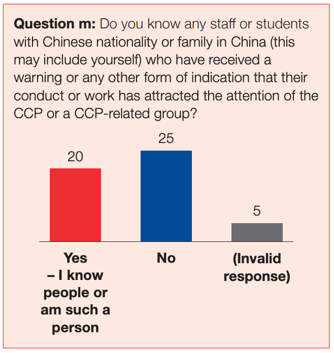 “One respondent stated that their Chinese students had confided in him that they had been asked to spy on campus events by Chinese police. Another scholar stated that they were told by Chinese students that surveillance is omnipresent and students are interviewed by officials when they return to China.”