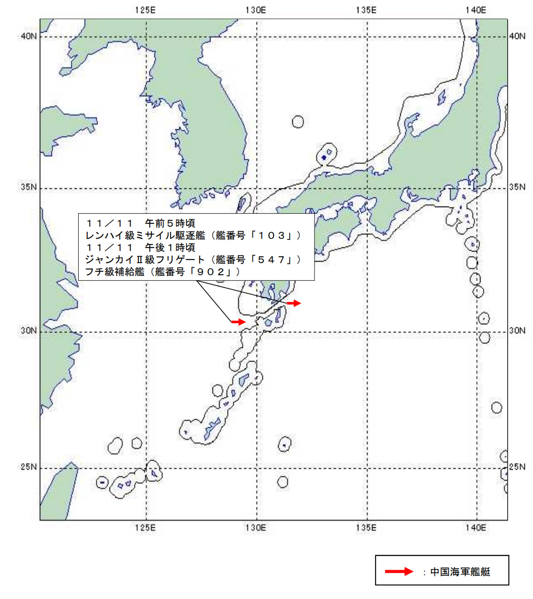 According to the Japanese Ministry of Defense, three ships of the PLA Navy (a destroyer, frigate and support ship) sailed through the Osumi Strait in southern Japan on November 11. The move came as an apparent response to Prime Minister Takaichi’s November 7 remarks.