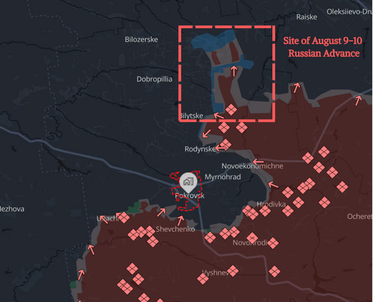 Between August 9-10 Russian forces made an unexpectedly rapid advance north of the city of Pokrovsk. Russian forces, which had been relentlessly attacking settlements near the city for months were able to bypass Ukrainian positions north of the city to advance 17 kilometers and threaten the supply routes to the city.