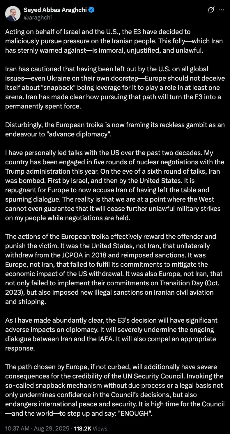 Iran’s Foreign Minister Abbas Araghchi issued a lengthy denunciation of France, Germany and the UK over their decision to restart sanctions on X on August 29. Araghchi taunted the European powers as vassals of the US looking to stay in Washington’s good graces and reassert themselves on the world stage after losing opportunities to influence events in Ukraine.