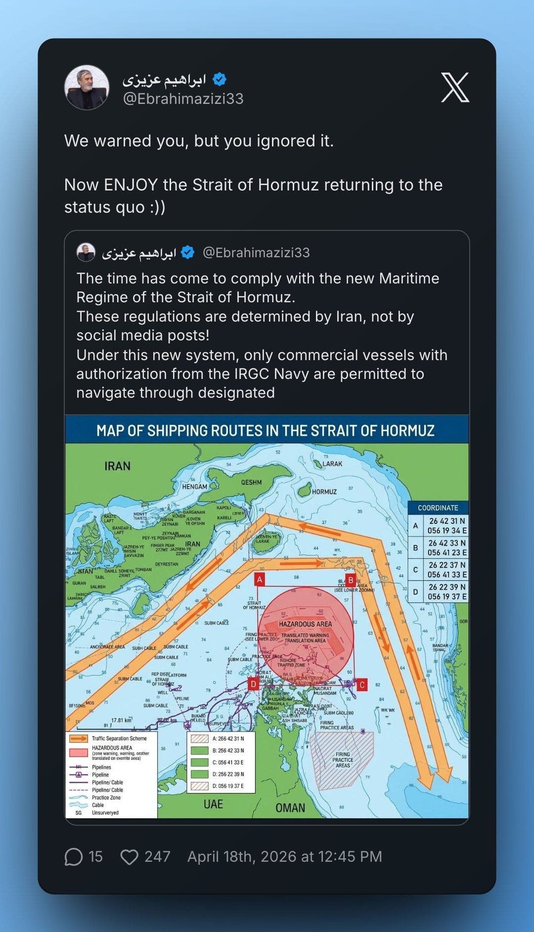 However, the policy was almost immediately thrown into question as other Iranian leaders including Ebrahim Azizi the head of the Iranian Parliament’s National Security Commission stated that the Strait was only open to ships who followed the instructions and approved routes of the Islamic Revolutionary Guard Corps and paid a toll. Azizi posted a map of approved and restricted shipping lanes to drive home his point.