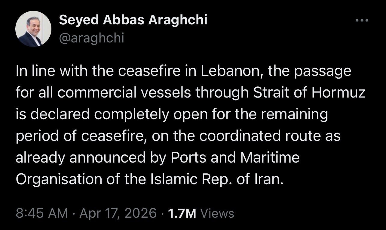 On April 17, Iranian Foreign Minister Abbas Araghchi announced that Iran was ending its blockade of the Strait of Hormuz in the wake of the ceasefire between Israel and Lebanon. The announcement coincided with a similar declaration by US President Trump.