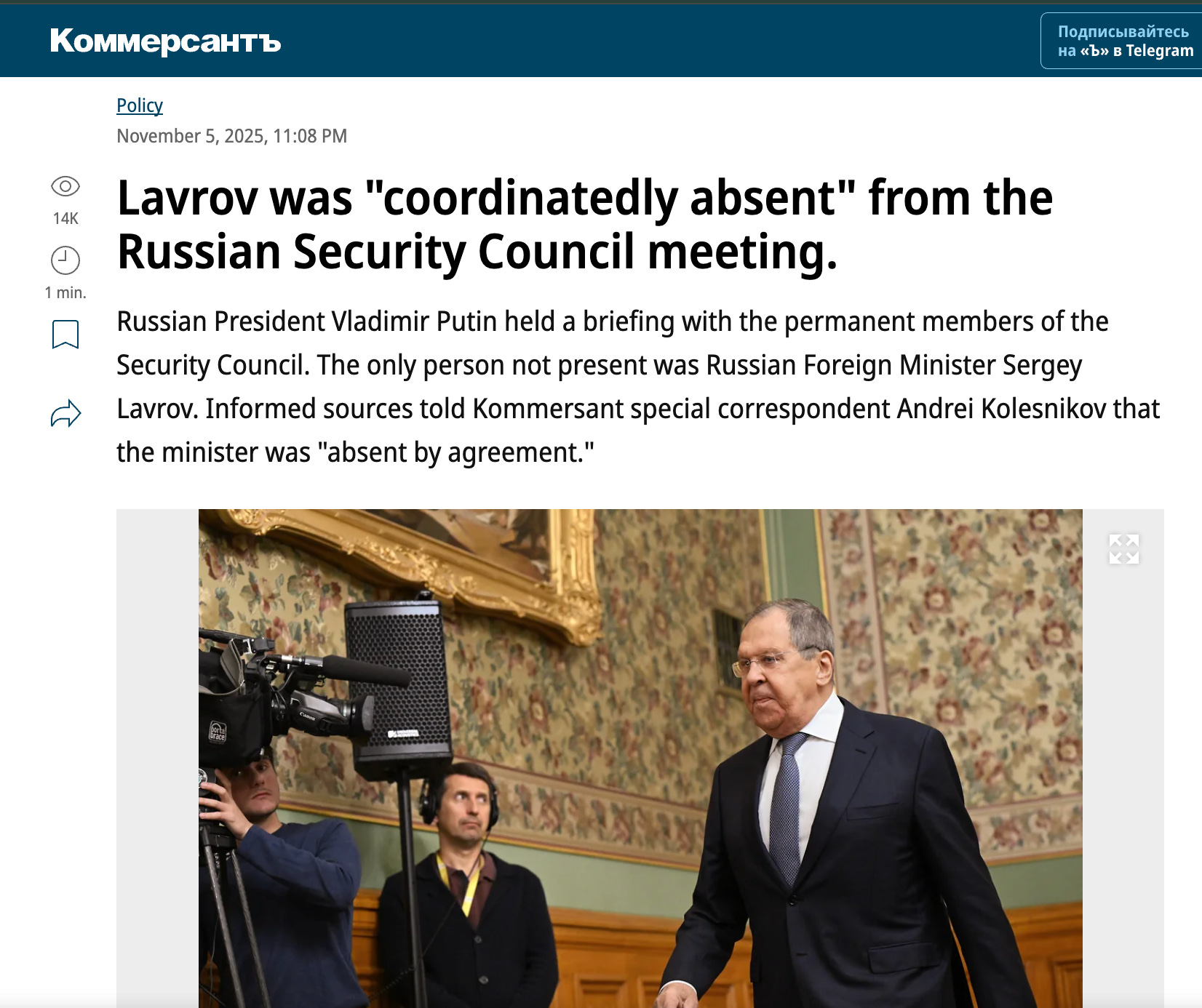 On November 5, Kommersant reported that long-serving Russian Foreign Minister Sergei Lavrov was deliberately excluded from a Security Council meeting held that day in which the resumption of nuclear tests was proposed.